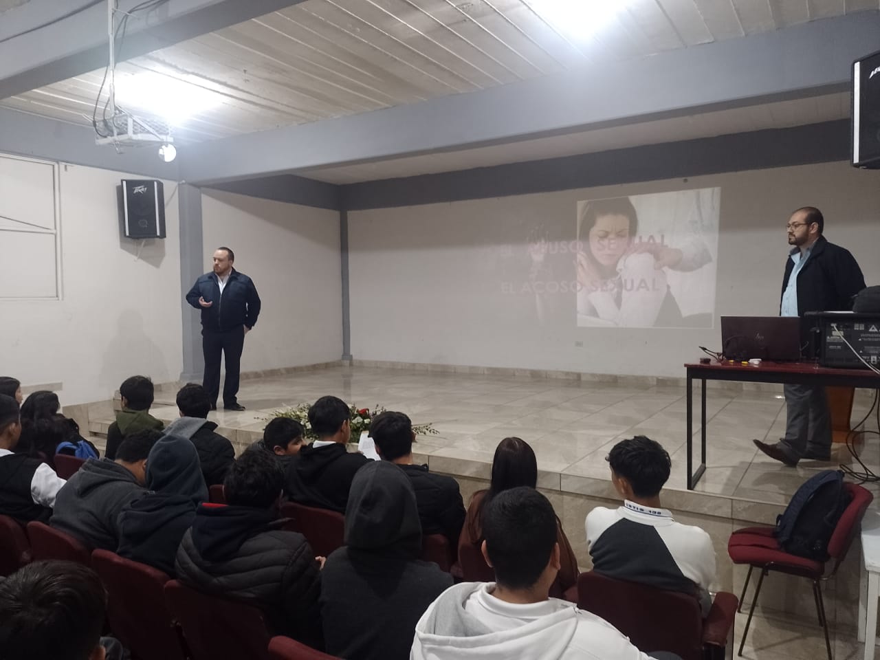 La plática fue impartida por los agentes del Ministerio Público Adrián Salas y Sergio Brito, quienes abordaron temas referentes a los delitos de abuso y acoso sexual, así como a identificar situaciones de riesgo que se deben evitar para no ser víctima de este tipo de ilícitos.