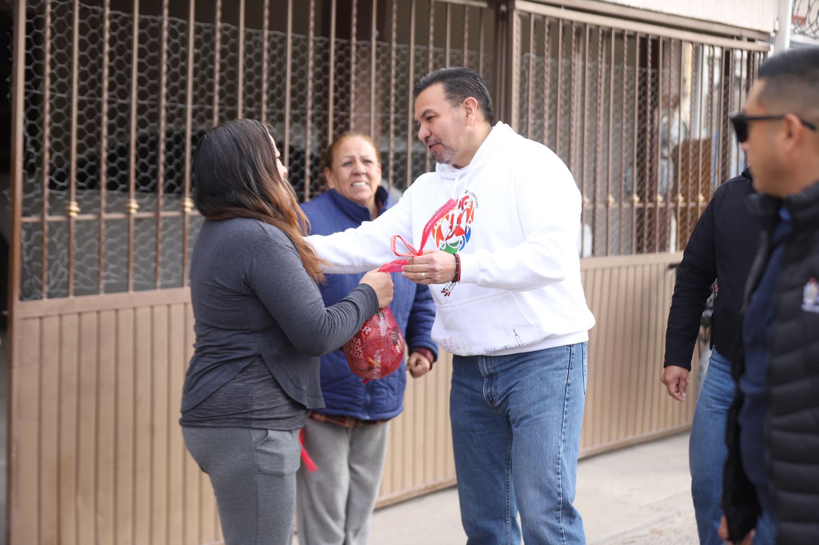 El Presidente Municipal, Cruz Pérez Cuéllar, acompañado del personal de la Dirección General de Desarrollo Social acudió a la colonia Morelos Uno para entregar mil piernas de puerco, como parte de las acciones de apoyo a las familias para que cuenten con alimentos para esta navidad.El alcalde recorrió la colonia casa por casa para hacer entrega de este alimento a los cientos de habitantes de este sector, quienes agradecieron por esta atención.“Es algo que hace la Dirección General de Desarrollo Social, pero me uno a las entregas con el fin de llevar algo para las familias que lo necesitan y desearles feliz Navidad”, expresó el edil.Hugo Alberto Vallejo Quintana, director de la dependencia, resaltó que con esta entrega suman ya 11 mil piernas entregadas en diferentes zonas de la ciudad, las cuales han sido distribuidas en las colonias de mayor vulnerabilidad al oriente y poniente de esta frontera.Señaló que las entregas continuarán hasta el próximo sábado 23 de diciembre, ya que tiene 17 mil piernas de puerco para entregar al mismo número de familias.Dijo que estos apoyos forman parte del programa Invierno Seguro, con el cual la siguiente semana empezará con la entrega de otros artículos y ayudas que se extienden hasta el mes de enero.“A partir de la siguiente semana estaremos acompañando al Presidente Municipal a las calles, pero ahora entregando lo que son cobijas y juguetes, vamos a cubrir la mayoría de las zonas de la ciudad”, agregó.En esta temporada invernal se contempla estregar de 40 a 45 mil cobijas, 3 mil calentones de leña, con suministro de madera por parte de la Dirección de Centros Comunitarios, 10 mil juguetes y siete mil chamarras.