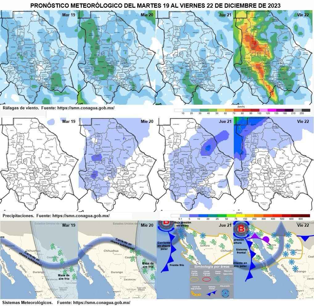 En cuanto a las lluvias, la dependencia indicó que pueden ser de dispersas a moderadas (de 5.1 a 25 mm) en Madera, Gómez Farías, Namiquipa, Temósachic, Ocampo y en Maguarichi de aisladas a dispersas (de 2.1 a 5 mm).También en Juárez, Ahumada, Guadalupe, Ascensión, Galeana, Ignacio Zaragoza, Buenaventura, Matachí, Moris, Uruachi, Chínipas, Urique, Bocoyna, Batopilas, Guachochi, Cusihuiriachi, Cuauhtémoc, Riva Palacio se esperan lluvias aisladas (de 0.1 a 2 mm).En Janos, Casas Grandes, Nuevo Casas Grandes, Carichí, Nonoava, Balleza, Morelos, San Francisco de Borja, Santa Isabel, Chihuahua, Aldama y Coyame las lluvias pueden estar acompañadas de caída de aguanieve en las partes altas de la sierra, incluidos Madera, Bocoyna, Guachochi y Balleza.