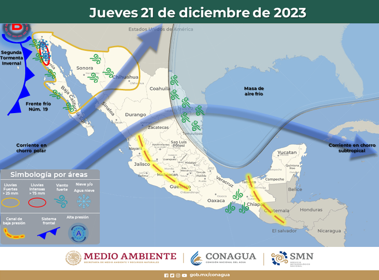 El frente frío No. 19 asociado a una baja presión en niveles medios y altos de la atmósfera dará origen a la Segunda Tormenta Invernal de la temporada, la cual se aproximará a la Península de Baja California, por lo que se prevén rachas fuertes de viento con posibles tolvaneras, lluvias puntuales intensas en Baja California y lluvias puntuales fuertes en Baja California Sur, Sonora y Chihuahua.
