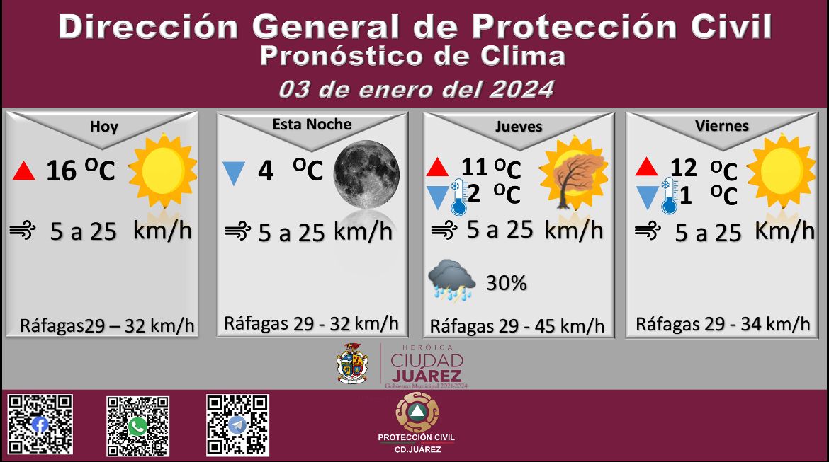 Roberto Briones Mota, titular de la dependencia, informó que para hoy se esperan ráfagas de viento que alcanzarán los 32 kilómetros por hora, en tanto que la velocidad del viento durante el día oscilará entre 5 y 25 kilómetros por hora.