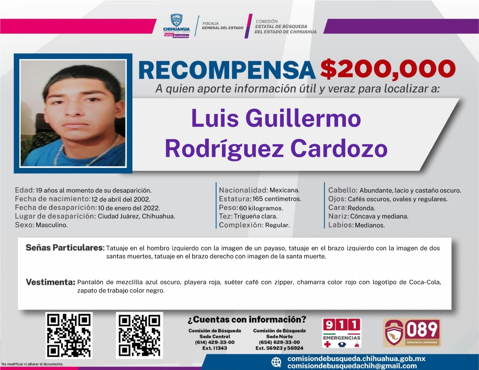 Al momento de su desaparición Luis Guillermo Rodríguez Cardozo, tenía 19 años y vestía pantalón de mezclilla color azul oscuro, playera roja, suéter café con zipper, chamarra roja con el logotipo de “Coca Cola” y zapatos negros de trabajo. Como señas particulares, cuenta con un tatuaje con la imagen de payaso en el hombro izquierdo; tatuajes con la figura de la santa muerte en el brazo izquierdo y brazo derecho.