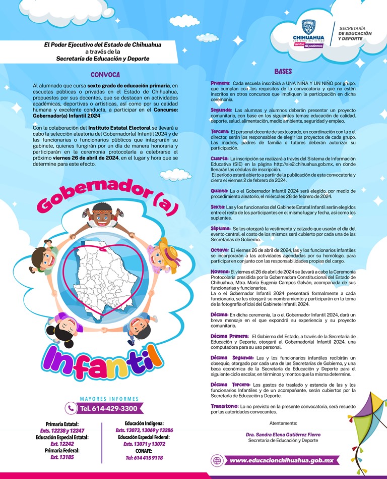 Con el firme propósito de promover y fomentar los valores cívicos, así como la participación democrática de la niñez chihuahuense, el Gobierno del Estado a través de la Secretaría de Educación y Deporte (SEyD), lanzó la convocatoria del concurso “Gobernador(a) Infantil 2024”, dirigida a estudiantes de sexto grado de primaria.