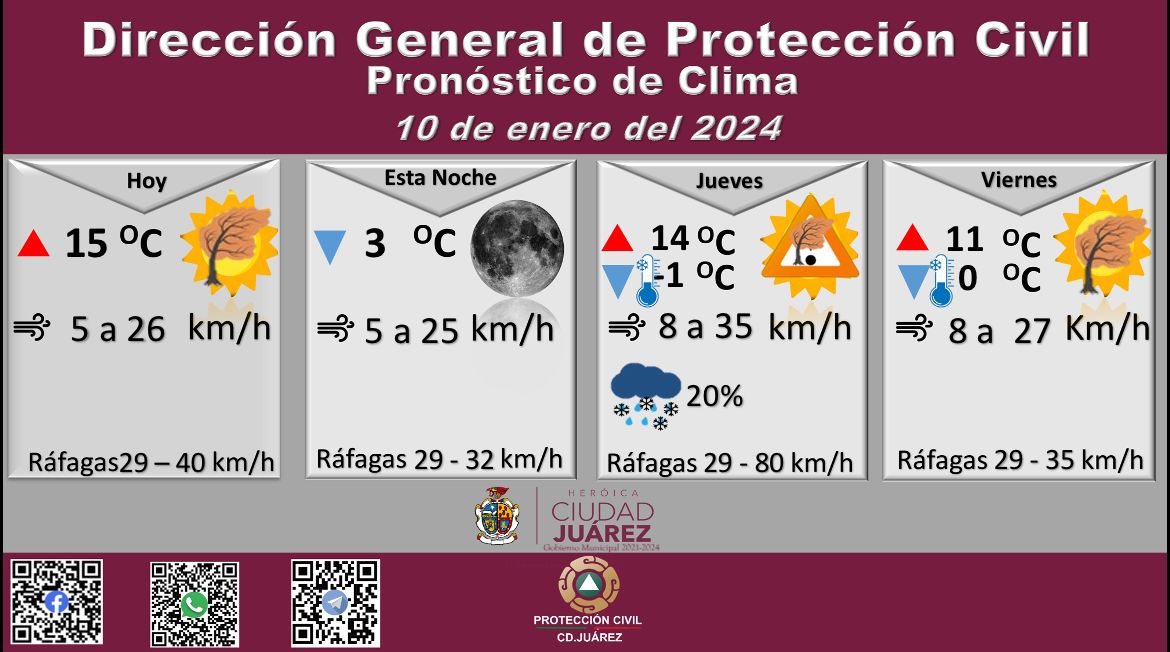 Roberto Briones Mota, titular de la dependencia, informó que para hoy se esperan fuertes ráfagas de viento que alcanzarán los 40 kilómetros por hora, en tanto que la velocidad del viento durante el día oscilará entre 5 y 26 kilómetros por hora.