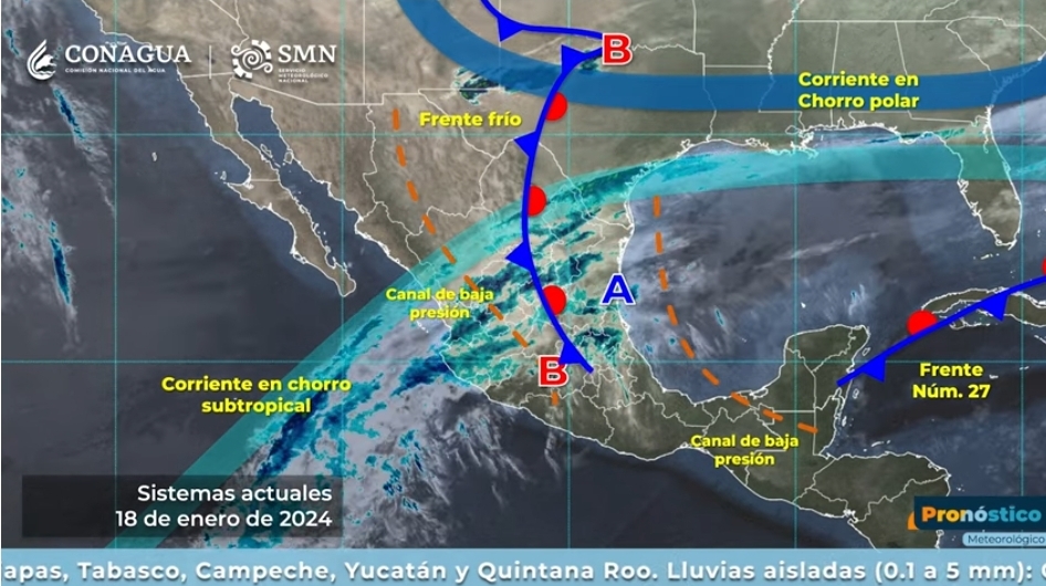 El frente No. 27 se extenderá con características cálidas sobre el Golfo de México y dejará de afectar a la República Mexicana; mientras que la masa de aire ártico que lo acompañó modificará sus características térmicas, permitiendo el incremento de las temperaturas en el norte, noreste y oriente del país.Durante la noche del jueves y primeras horas del viernes, un nuevo frente frío se aproximará a la frontera norte y noreste del territorio nacional, en combinación con la corriente en chorro subtropical, ocasionará vientos fuertes con tolvaneras en Chihuahua, Coahuila, Nuevo León y Tamaulipas.