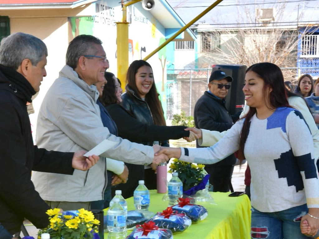 El acto protocolario tuvo lugar en el Jardín de Niños Miguel Hidalgo, ubicado en la calle Eduwiges Rey de Quezada número 10020, colonia Infonavit Juárez Nuevo, en donde el representante de la gobernadora Maru Campos en Ciudad Juárez, Oscar Ibáñez Hernández, señaló que el tener unas finanzas sanas, permite al Estado multiplicar beneficios para las y los juarenses.