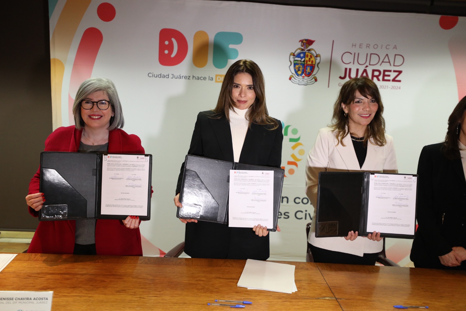 El Sistema para el Desarrollo Integral de la Familia del Municipio de Juárez (DIF) firmó un convenio de colaboración con el Centro de Fortalecimiento de las Organizaciones de la Sociedad Civil (CFOSC), con el fin de apoyar a las agrupaciones que trabajan a favor de las niñas, niños y adolescentes de esta frontera.Rubí Enríquez, presidenta de DIF Municipal y María Eloísa Solís Terrazas, directora y representante del CFOSC, encabezaron el evento que se llevó a cabo en la Unidad Administrativa “Lic. Benito Juárez” (presidencia municipal), donde resaltaron la importancia de este convenio que beneficiará a los Centros de Atención Infantil (CAI) y albergues.“Estamos muy contentos por este acto que firmaremos hoy, es un convenio de colaboración con Centro de Fortalecimiento de las Organizaciones de la Sociedad Civil”, dijo Enríquez.La presidenta de DIF destacó el compromiso del Gobierno Municipal por apoyar a las organizaciones de la sociedad civil para que, a través de este convenio, puedan obtener recursos para continuar con sus proyectos.“Este Gobierno Municipal ha puesto el ejemplo innegable del trabajo en conjunto, tanto con las organizaciones de la sociedad civil, como con las entidades educativas de todos los niveles, con padres y madres de familia y en general con toda la población, porque no hay mejor manera que llegar a la meta que trabajar de manera coordinada, en equipo y codo a codo”, expresó.El CFOSC es una organización chihuahuense con 20 años de experiencia en el fortalecimiento de capacidades institucionales y profesionalización de organizaciones de la sociedad civil, redes de organización y personas entrenadoras sociales.Durante este tiempo se ha trabajado en implementar estrategias de acompañamiento, capacitación, asesoría y vinculación para fortalecer la atención principalmente a niñas, niños y adolescentes.“Para nosotros poder integrar esta alianza entre la sociedad civil, los gobiernos locales y entre las organizaciones, que a través de sus actividades de proyectos y de su profesionalización están generando el gran impacto en nuestra comunidad, nos genera muchísimo orgullo y muchísima honra”, dijo la directora y representante del CFOSC.En el evento también estuvieron Lucía Chavira, directora general del DIF Municipal y Nidia Quezada, coordinadora de enlaces con las asociaciones civiles.