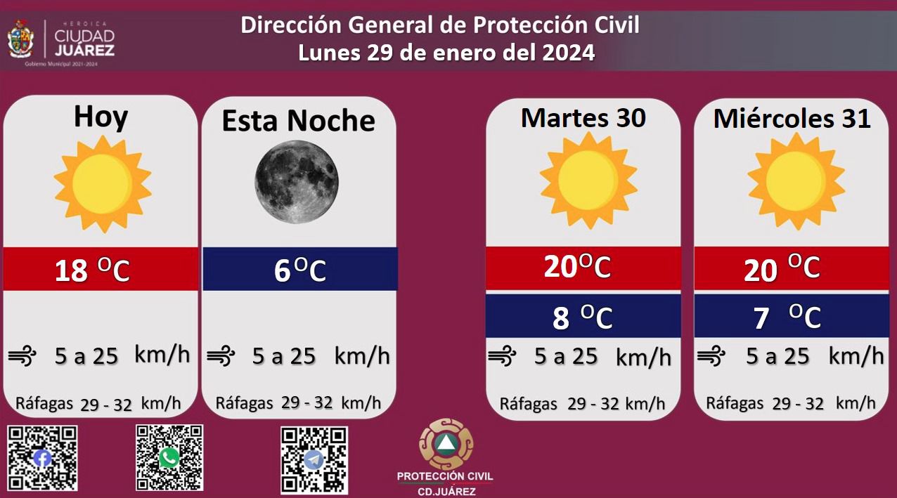 La Dirección General de Protección Civil, con base en informes del Servicio Meteorológico Nacional, pronostica un lunes soleado con una temperatura máxima de 18 grados Celsius, mientras que la mínima será de 6 °C para esta noche.Roberto Briones Mota, titular de la dependencia, informó que para hoy se esperan fuertes ráfagas de viento que alcanzarán los 32 kilómetros por hora, en tanto que la velocidad del viento durante el día oscilará entre 5 y 25 kilómetros por hora.Para mañana martes se esperan fuertes ráfagas de viento que llegarán los 32 kilómetros por hora, la temperatura máxima se pronostica en los 20 °C, mientras que la mínima será de 8 °C, la velocidad del viento oscilará de 5 a 25 kilómetros por hora.El miércoles será un día soleado, se esperan ráfagas de viento de 32 kilómetros por hora, con una temperatura máxima de 20 °C y mínima de 7 °C, la velocidad del viento será de 5 a 25 kilómetros por hora.El Servicio Meteorológico Nacional informa que una vaguada polar ingresará sobre la Península de Baja California, en interacción con el flujo de humedad generado por la corriente en chorro subtropical, propiciarán lluvias y chubascos, así como viento con rachas de 40 a 60 km/h en el noroeste de México, incluido el Golfo de California.Asimismo, prevalecerá una baja probabilidad de lluvia en el norte, noreste, oriente, centro, occidente y sur del territorio nacional.
