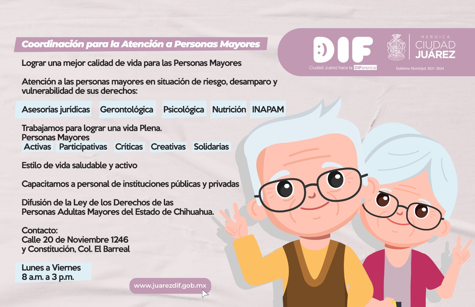 El Sistema para el Desarrollo Integral de la Familia del Municipio de Juárez (DIF), a través de la Coordinación de Atención a Personas Mayores, ofrece a la población diversos servicios para la atención de las necesidades de este grupo etario.