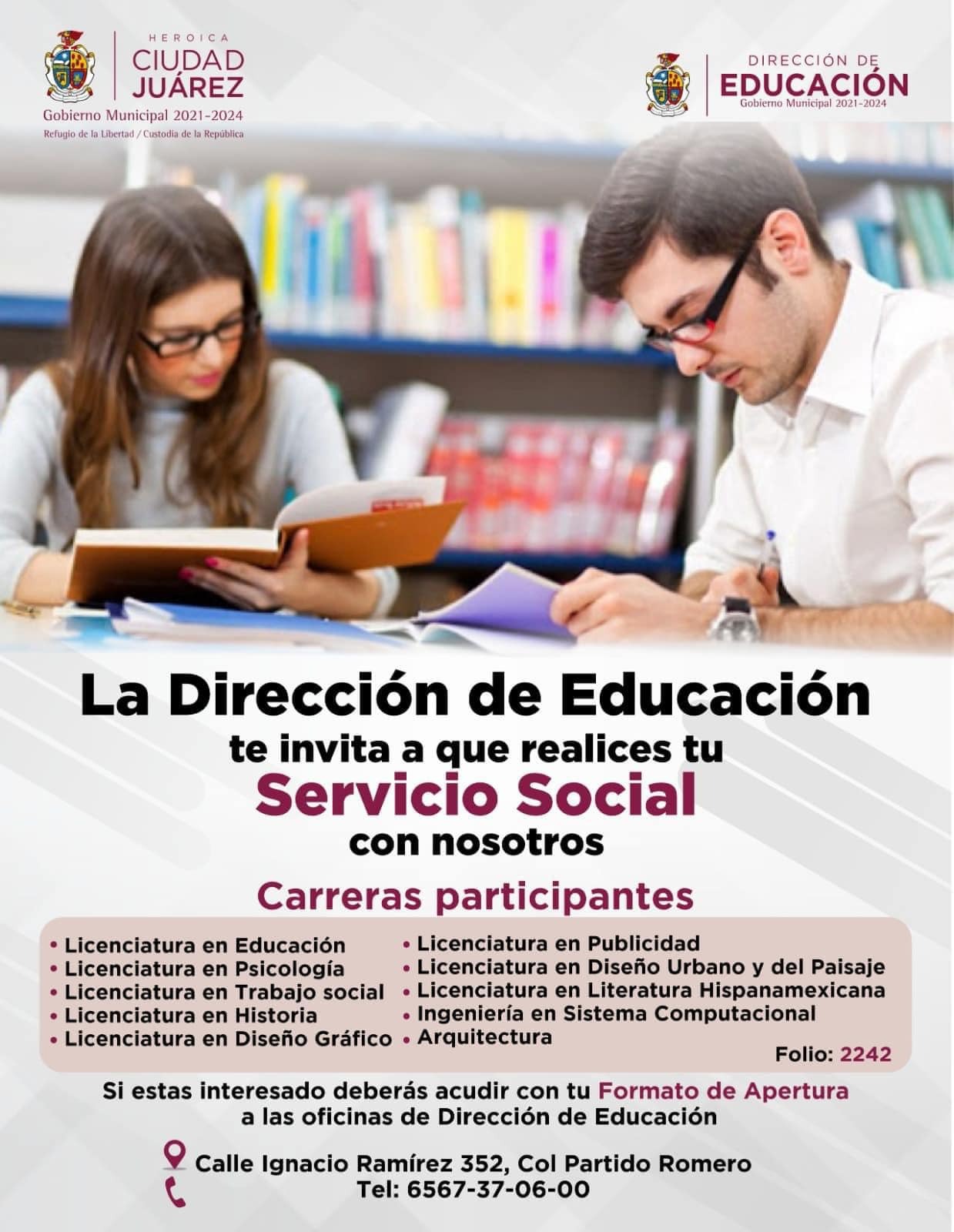 El Gobierno Municipal invita a los jóvenes que estudian la universidad y que aún no han hecho su servicio social, para que lo hagan en la Dirección de Educación.De acuerdo con la convocatoria, las carreras participantes son las Licenciaturas en Educación, Psicología, Trabajo Social, Historia, Diseño Gráfico, Publicidad, Diseño Urbano y del Paisaje, Literatura Hispanomexicana, así como Ingeniería en Sistema Computacional y Arquitectura.Los estudiantes interesados en participar pueden ingresar al link https://escolar.uacj.mx/…/serviciosoc…/EmpProyectos.aspx y revisar los lugares disponibles.También deben acudir con su formato de apertura a las oficinas de Educación ubicadas en la calle Ignacio Ramírez 351 y avenida Vicente Guerrero, a un costado del Parque Borunda, de lunes a viernes en horario de 8:00 de la mañana a 2:30 de la tarde.Para mayor información, pueden comunicarse al número telefónico (656) 737 0600.