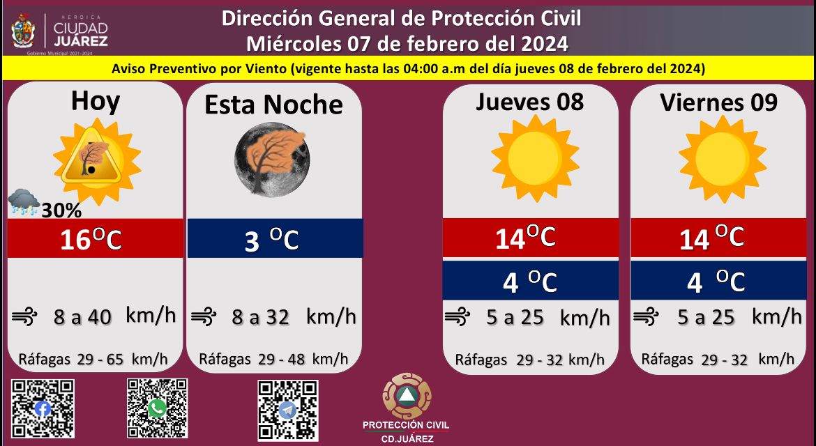 La Dirección General de Protección Civil, con base en informes del Servicio Meteorológico Nacional, pronostica fuertes ráfagas de viento que podrían alcanzar los 65 kilómetros por hora este miércoles, informó Roberto Briones Mota, titular de la dependencia.Para este día se espera una temperatura máxima de 16 grados Celsius, mientras que la mínima será de 3 °C para esta noche, además existe un 30 por ciento de probabilidad de lluvia, la velocidad del viento oscilará entre 8 y 40 kilómetros por hora.Para mañana jueves se esperan fuertes ráfagas de viento que llegarán los 32 kilómetros por hora, la temperatura máxima se pronostica en los 14 °C, mientras que la mínima será de 4 °C, la velocidad del viento oscilará de 5 a 25 kilómetros por hora.El viernes será un día soleado, se esperan ráfagas de viento de 32 kilómetros por hora, con una temperatura máxima de 14 °C y mínima de 4 °C, la velocidad del viento será de 5 a 25 kilómetros por hora.El Servicio Meteorológico Nacional informa que el frente frío número 33 recorrerá el norte del país, mientras que la sexta tormenta invernal se desplazará lentamente sobre el noroeste y parte del norte de la República Mexicana.Este fenómeno producirán vientos muy fuertes a intensos con posibles tolvaneras, ambiente frío a gélido, chubascos y lluvias fuertes en dichas regiones, con posible caída de nieve o aguanieve en zonas de Baja California, Sonora y Chihuahua.Se prevé que al final del día la sexta tormenta invernal se interne al sur de Estados Unidos y deje de afectar al territorio nacional.