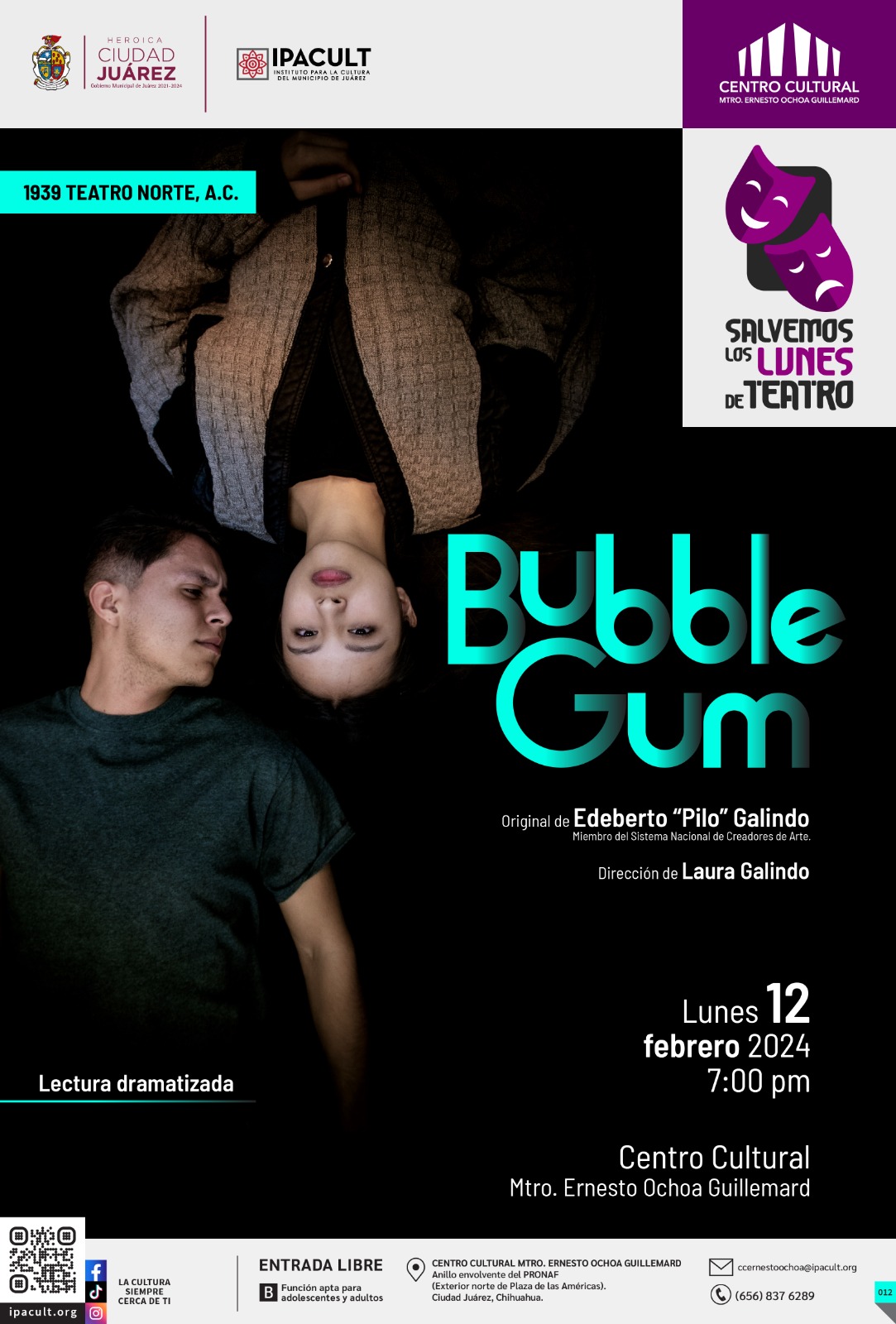 Como parte de las actividades gratuitas para la comunidad que lleva a cabo el Instituto para la Cultura del Municipio de Juárez (IPACULT), de nueva cuenta, este 2024 se retoma el programa Salvemos los lunes de teatro.La lectura dramatizada para el próximo lunes 12 de febrero es “Bubble Gum”, que se estará presentando a las 7:00pm en el Centro Cultural Ernesto Ochoa Guillemard, situado en la avenida Lincoln en el anillo envolvente del Pronaf del condominio La Plata.Esta historia comienza cuando el joven Iracheta encuentra en el baño de la escuela a su novia colgada de un cable. Días antes, habían terminado su relación amorosa de manera pública por la red social de Facebook.Pareciera que la historia termina aquí, sin embargo, apenas comienza en una retrospectiva obligada para entender lo que realmente sucedió con ambos.Los actores encargados de dar vida a los personajes son: Gisselle López, quien interpreta a “Ramírez” y Alan Chagoyán es “Iracheta”. La dirección correrá a cargo de Laura Galindo.Salvemos los lunes de teatro, comparte historias originales del dramaturgo Edeberto “Pilo” Galindo, quien cuenta con amplia trayectoria, ya que tiene más de 60 obras originales. Además, es miembro del Sistema Nacional de Creadores de Arte (SNCA).