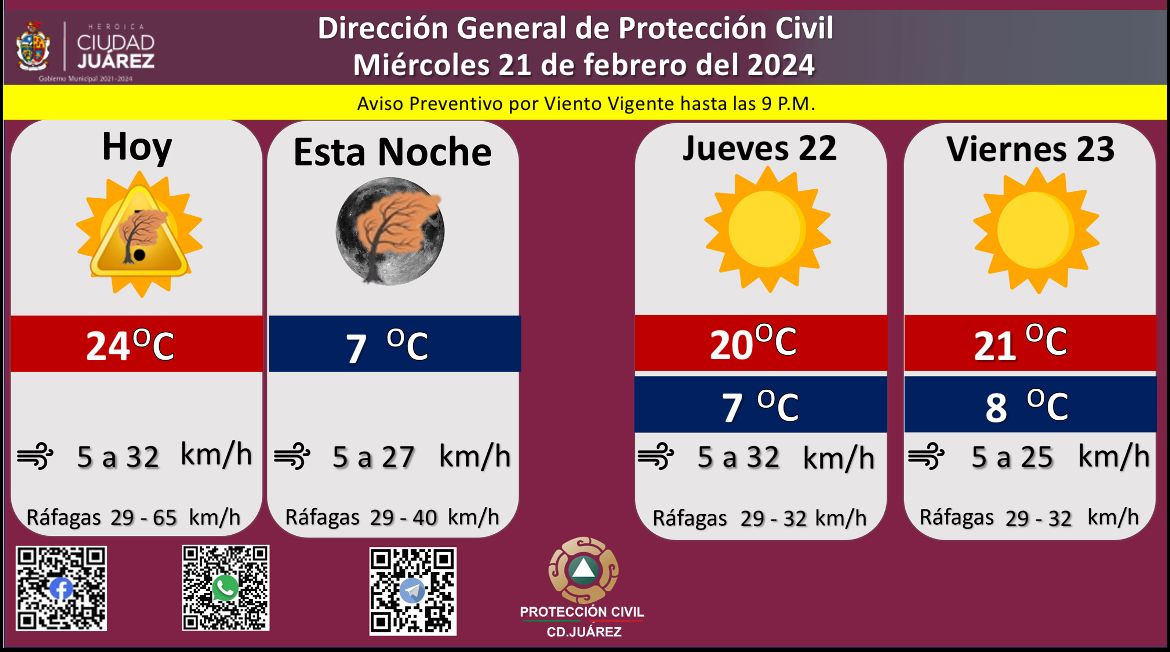 Roberto Briones Mota, titular de la dependencia, exhortó a la ciudadanía a tomar precauciones debido a que hoy se esperan fuertes ráfagas de viento que alcanzarán los 65 kilómetros por hora, en tanto que la velocidad del viento durante el día oscilará entre 5 y 32 kilómetros por hora.