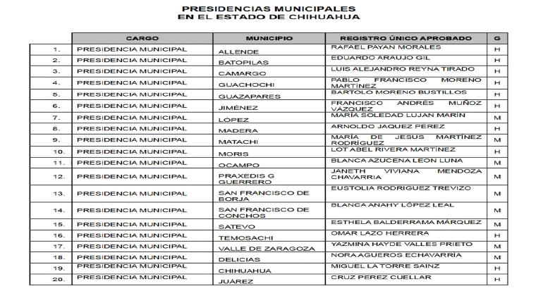 Destaca que en Ciudad Juárez va por la reelección el actual alcalde, Cruz Pérez Cuéllar, mientras que para Chihuahua capital se postulará a Miguel LaTorre Sáenz, quien fuera diputado y miembro del Partido Acción Nacional.Por su parte, en Delicias se postulará Nora Agüeros y en Camargo a Luis Alejandro Reyna Tirado.