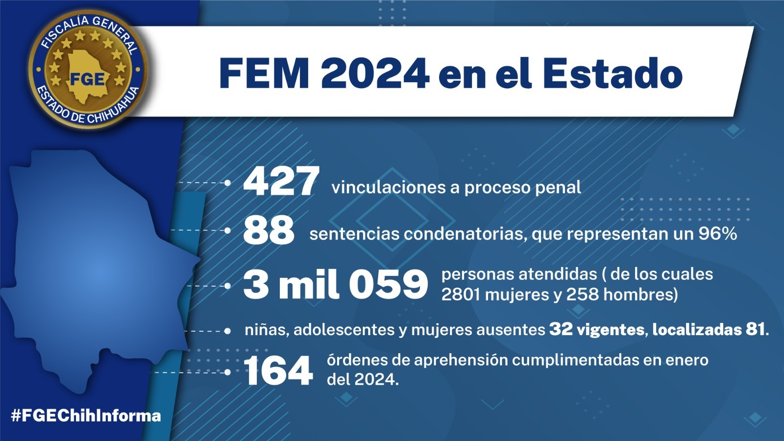 De las 1,453 resoluciones, 714 corresponden a Zona Centro, 394 a la Zona Norte, 10 a la Zona Noroeste, 132 de la Zona Occidente y 203 en la Zona Sur. Además, se cumplimentaron 164 órdenes de aprehensión por los diversos delitos de género en el estado.