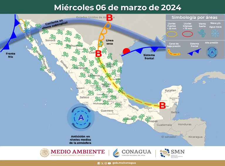 Para este día, un frente frío sobre el sur de los Estados Unidos y la aproximación del frente frío número 39 al noroeste del país, en interacción con la corriente en chorro y un canal de baja presión, favorecerá condiciones de ambiente fresco por la mañana, de cálido a poco caluroso por la tarde.