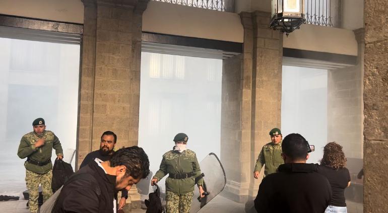 Al ingresar los manifestantes fueron lanzadas en los patios de Palacio Nacional bombas de humo, provocando una situación tensión en el lugar, asimismo elementos de seguridad resguardaron y cerraron el acceso al salón Tesorería, donde se desarrolla la mañanera, la cual siguió de manera normal y sin interrupciones.