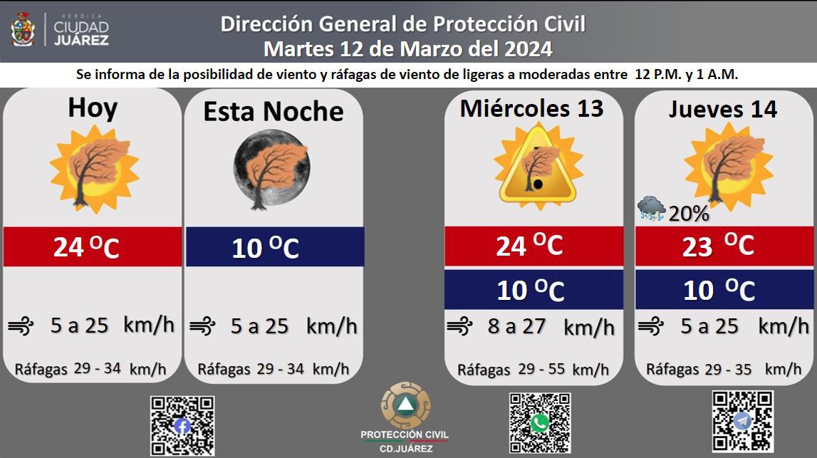 Para mañana miércoles se esperan fuertes ráfagas de viento que llegarán a los 55 kilómetros por hora, la temperatura máxima se pronostica en los 24 °C, mientras que la mínima será de 10 °C, la velocidad del viento oscilará de 8 a 27 kilómetros por hora.