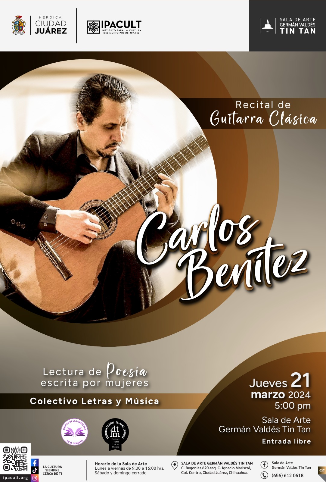 La Sala de Arte Germán Valdés “Tin Tan” presenta en punto de las 5:00 de la tarde, el recital de guitarra clásica con las notas de Carlos Benítez y la lectura de poesía escrita por mujeres del Colectivo Letras y Música.