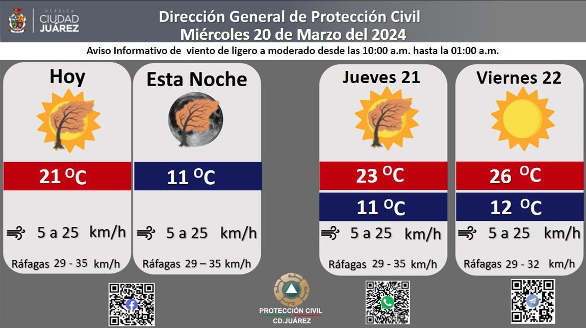 Para mañana jueves se esperan fuertes ráfagas de viento que llegarán a los 35 kilómetros por hora, la temperatura máxima se pronostica en los 23 °C, mientras que la mínima será de11 °C, la velocidad del viento oscilará de 5 a 25 kilómetros por hora.