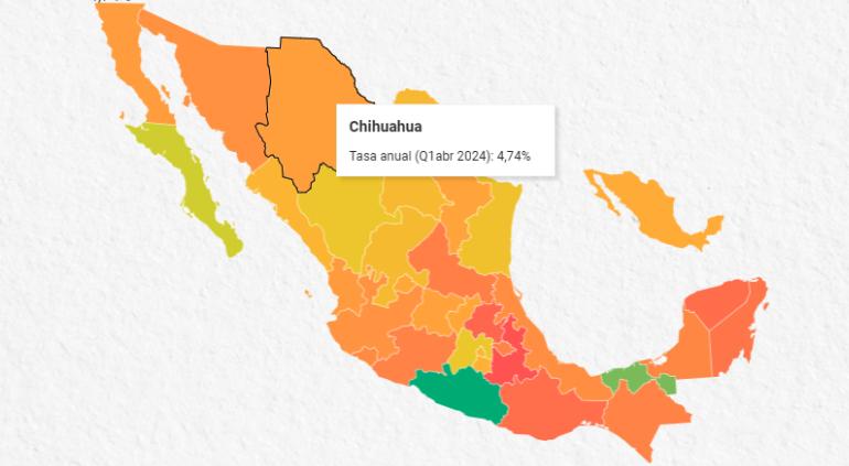 El dato de inflación de Chihuahua fue el décimo séptimo mayor entre las entidades federativas del paísPor esto último, descendió una posición entre los estados que más inflación presentan.No obstante, a nivel nacional fue menor; 4.63%, aunque también tuvo una alza en estas dos semanas.
