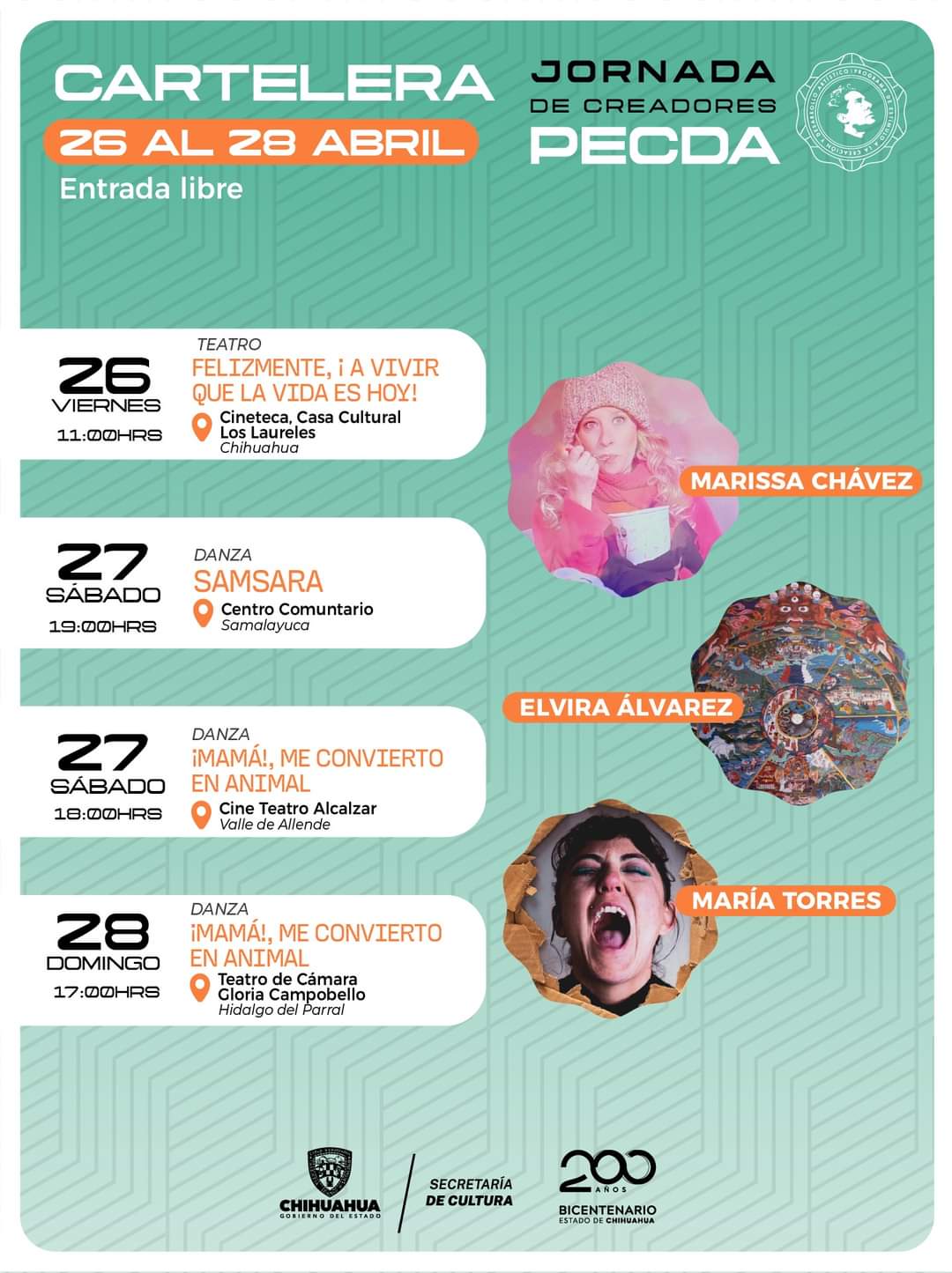 La Secretaría de Cultura, y el Sistema de Apoyos a la Creación y Proyectos Culturales, invitan a la Jornada de Creadores del Programa de Estímulo a la Creación y Desarrollo Artístico (Pecda), que se realizará de forma gratuita del 26 al 28 de abril en Chihuahua, Juárez, Parral y Allende.