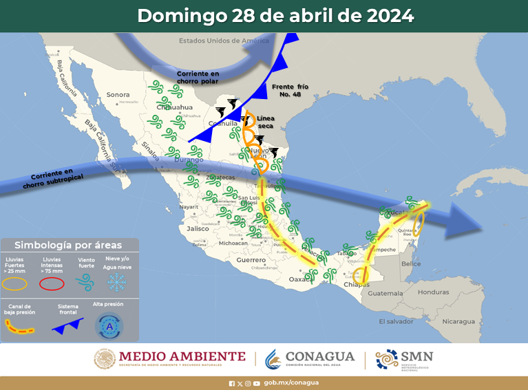 El frente frío No. 48 se desplazará sobre el noreste de la República Mexicana en interacción con una línea seca que prevalecerá en dicha región y con las corrientes en chorro polar y subtropical, producirán vientos fuertes a muy fuertes con tolvaneras en el norte y noreste del país.