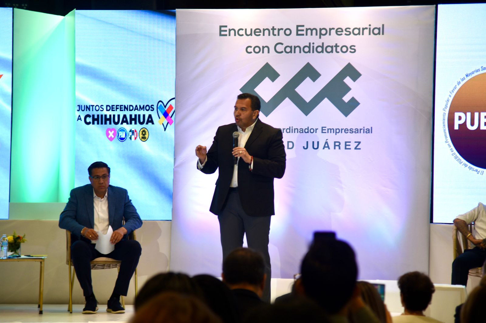 Cruz Pérez Cuéllar, candidato de la coalición “Sigamos Haciendo Historia por Chihuahua”, participó en el encuentro de candidatos a la alcaldía de Ciudad Juárez, organizado por el Consejo Coordinador Empresarial (CCE).