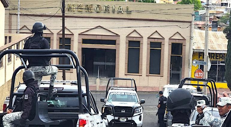 Efectivos de la Guardia Nacional y de la Policía Estatal se hicieron presentes para asegurar el área y resguardar el perímetro cercano a la capilla ardiente, donde se esperaba velar los cuerpos de las víctimas.