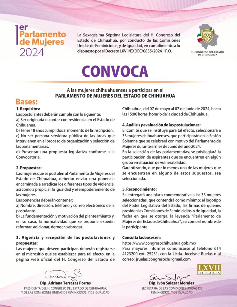 El Congreso del Estado de Chihuahua, a través de las Comisiones Unidas de Feminicidios, y de Igualdad, invitó al primer Parlamento de Mujeres 2024.