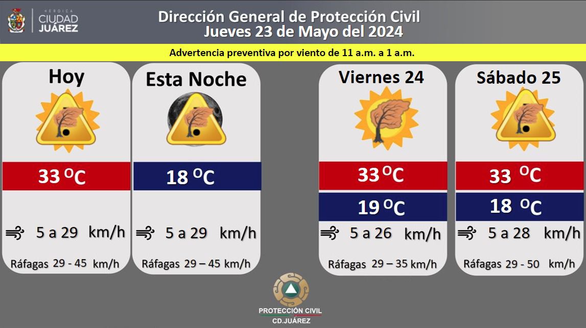 Los vientos se mantendrán en promedio de 5 a 28 kilómetros por hora y las ráfagas entre 29 y 45 kilómetros, con excepción del sábado que podrían incrementar hasta los 50 kilómetros por hora.