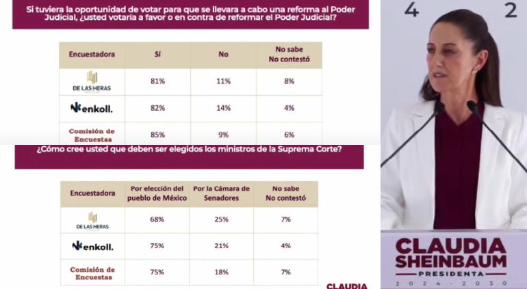 Durante conferencia de prensa, Sheinbaum presentó diapositivas con los resultados de tres encuestas que levantaron para conocer si la población está de acuerdo con la Reforma al Poder Judicial que viene en el Plan C, así como para saber las opiniones en otros puntos.