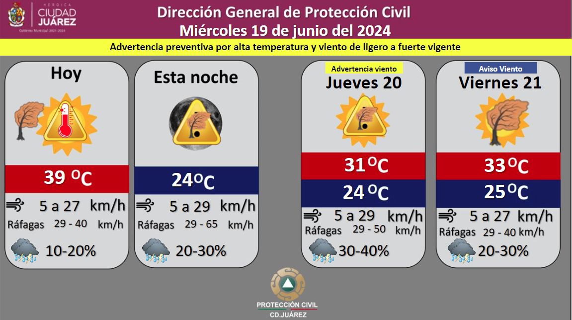 Para mañana jueves se esperan ráfagas de viento que llegarán a los 50 kilómetros por hora, existe una probabilidad de lluvia de un 40 por ciento, la temperatura máxima se pronostica en los 31 °C, mientras que la mínima será de 24 °C, la velocidad del viento oscilará de 5 a 29 kilómetros por hora.