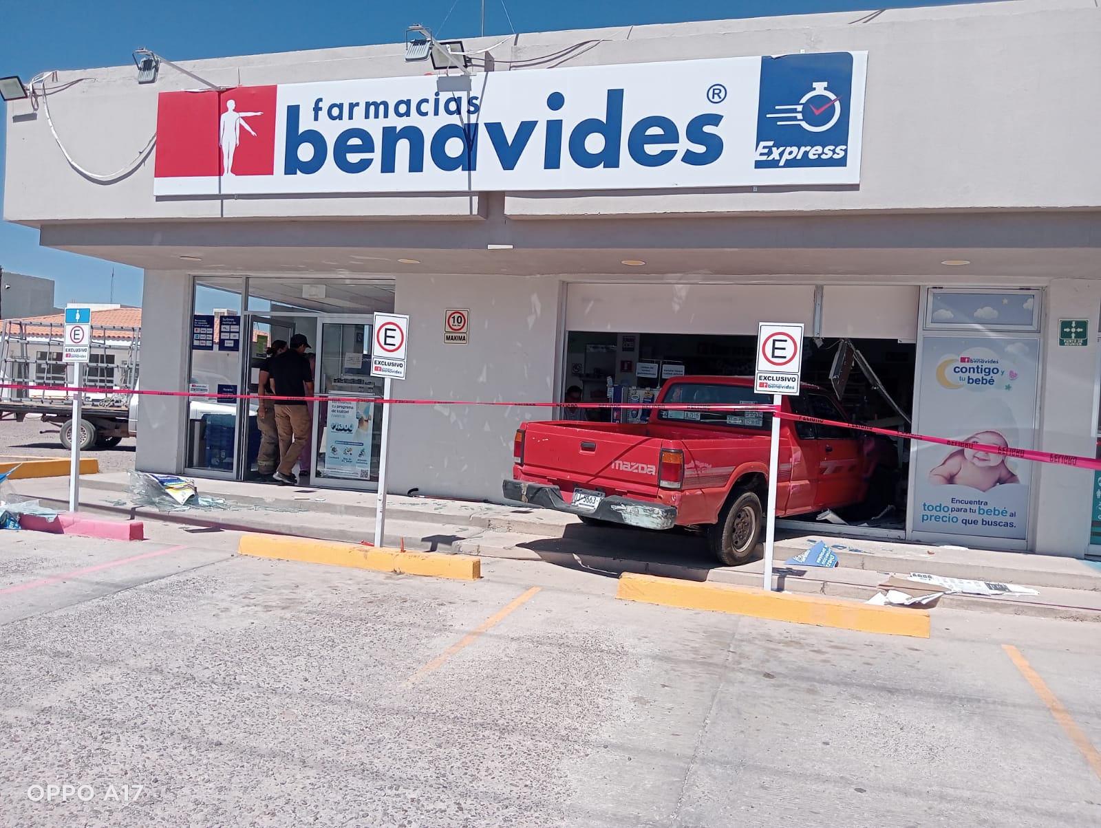 La mañana de este martes, a las 10:30 horas, la conductora de una camioneta Mazda Pick Up de color rojo, al circular por la Av. Juárez en sentido sur-norte, perdió el control de la unidad provocando que se subiera a la banqueta, brincara los topes de seguridad y se introdujera en el local que ocupa la Farmacia Benavides provocando severos daños, tanto en el ventanal y puerta de acceso, como en el interior donde afectó varios exhibidores.