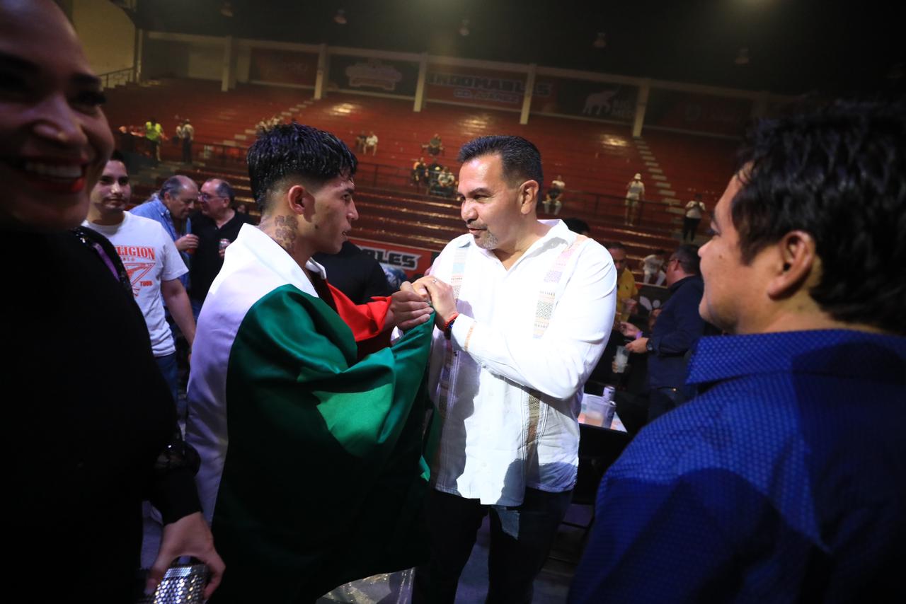 El Presidente Municipal Cruz Pérez Cuéllar, felicitó a cada uno de los peleadores juarenses para después confirmar su presencia en esta noche sabatina de boxeo.