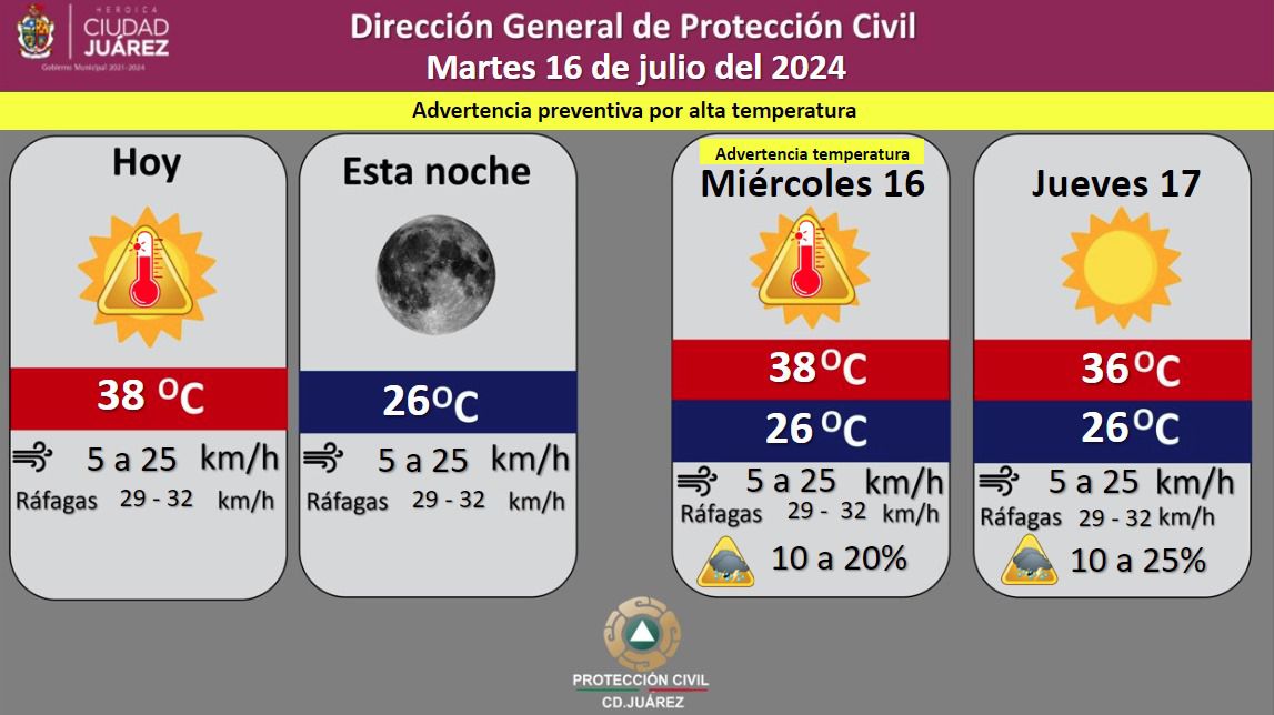 La Dirección General de Protección Civil, con base en informes del Servicio Meteorológico Nacional, pronostica un martes soleado, con una temperatura máxima de 38 grados Celsius, mientras que la mínima será de 26 °C para esta noche.