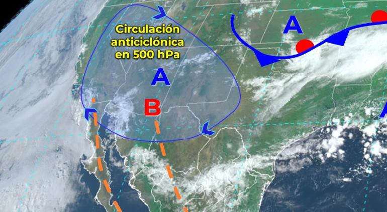 El Servicio Meteorológico Nacional (SMN) de Conagua compartió su imagen de sistemas meteorológicos presentes en estos momentos, destacando la circulación anticiclónica en 500 hPa que se posicionó sobre el norte de Chihuahua y Sonora.