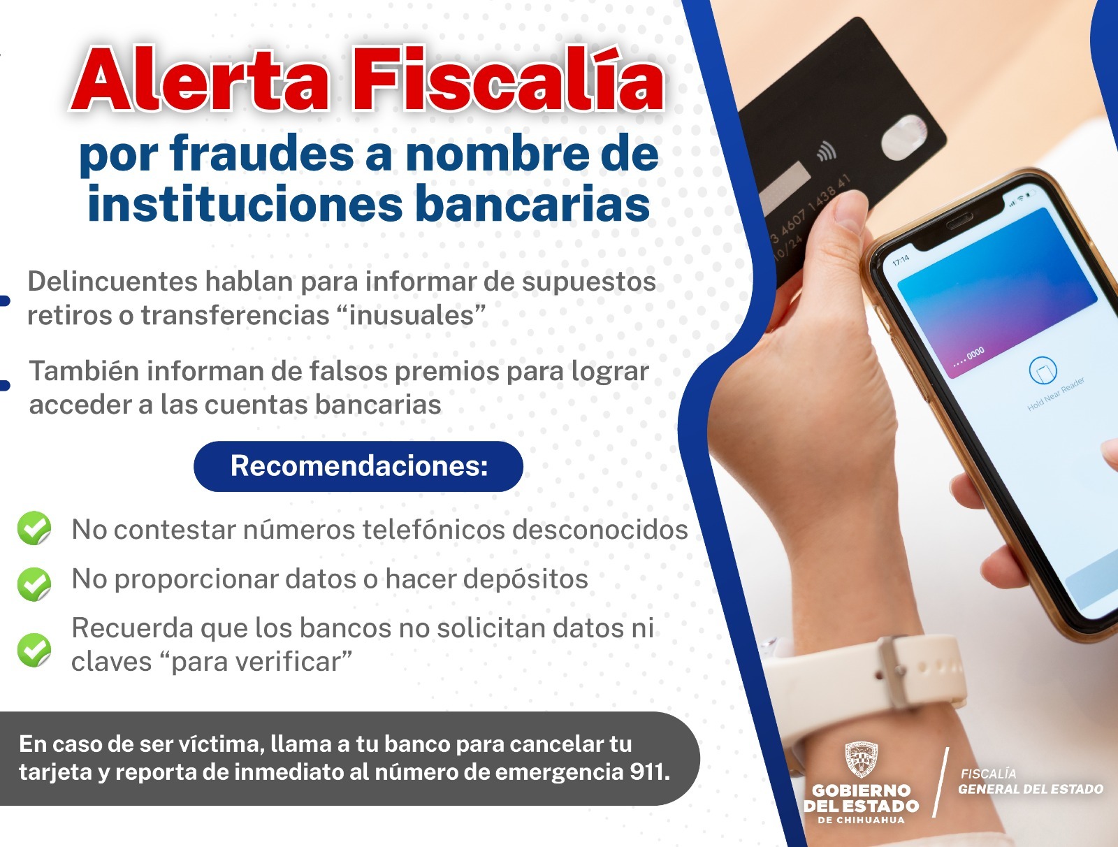 La Fiscalía General del Estado hace un llamado a la población para que no se deje sorprender por delincuentes que hablan a nombre de instituciones bancarias informando por supuestos retiros de montos económicos “inusuales” o que anuncian premios falsos para engañar a los cuentahabientes.