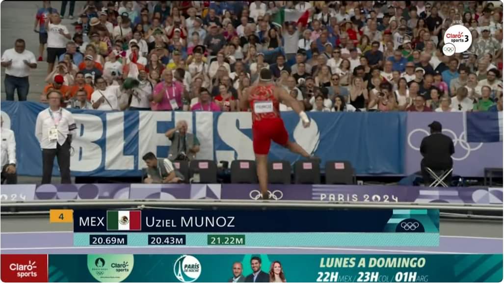 Para el tercer lanzamiento, el chihuahuense logró asegurar su pase a la final al marcar 21.22 metros.