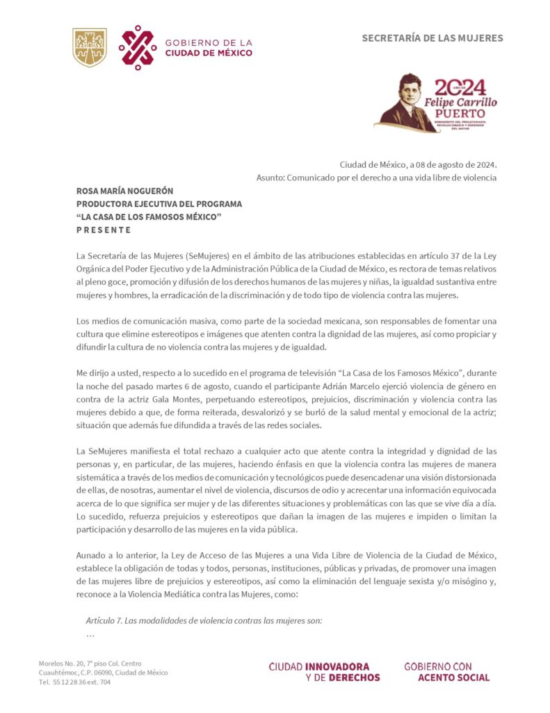 La Secretaría de las Mujeres de la Ciudad de México ha emitido un contundente llamado a la producción del programa de televisión “La Casa de los Famosos México” tras la exhibición de violencia de género durante la transmisión del pasado 6 de agosto.