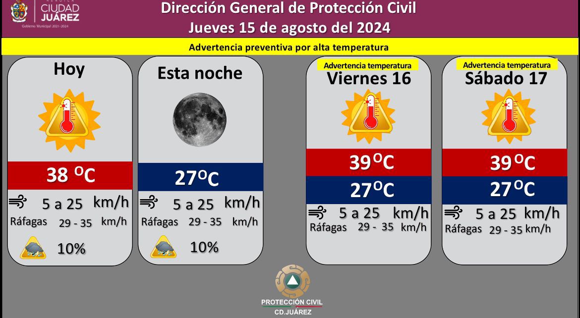 La Dirección de Protección Civil informa que para hoy jueves se espera un cielo despejado, con temperatura máxima de 38 grados Centígrados y mínima de 27 grados.