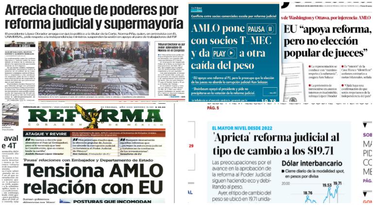 Este miércoles, la mayoría de los periódicos relevantes mostraron en sus portadas cómo conmocionó al país la “pausa” diplomática con EE.UU. y Canadá, la caída del peso mexicano y la Reforma Judicial, hechos que se relacionan entre sí.