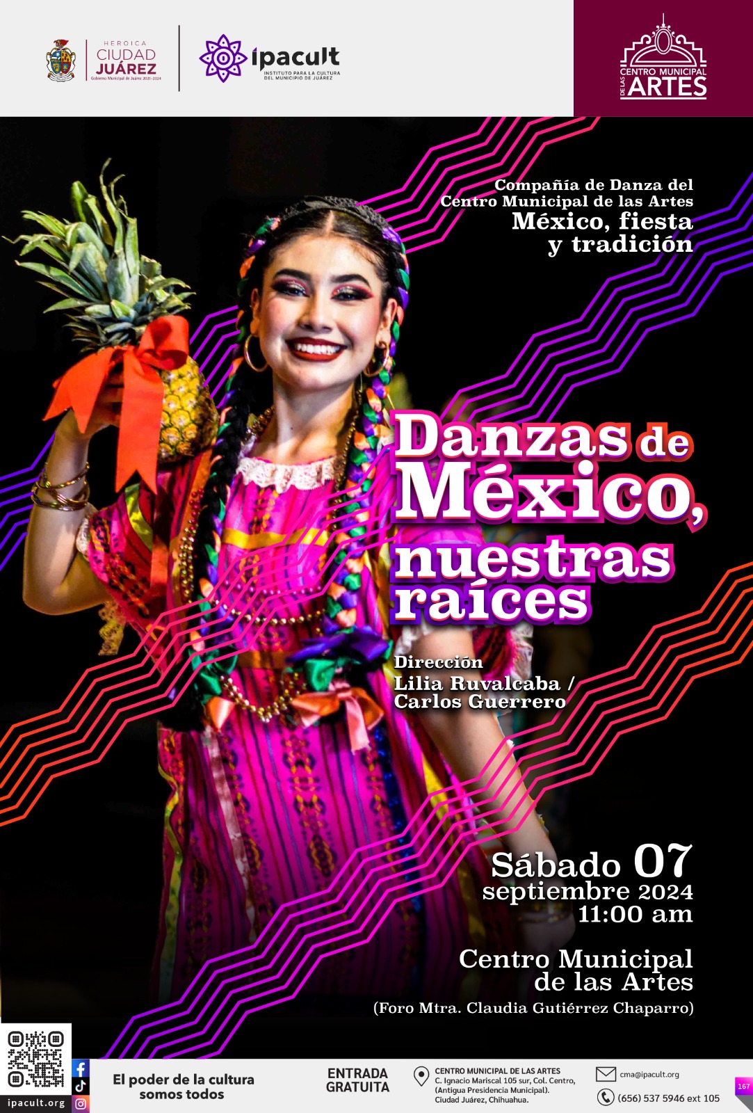 El Instituto para la Cultura del Municipio de Juárez (IPACULT) invita a la comunidad a disfrutar del espectáculo “Danzas de México, nuestras raíces”, que sigue cautivando al público con sus presentaciones cada sábado en el foro “Claudia Gutiérrez” del Centro Municipal de las Artes (CMA).