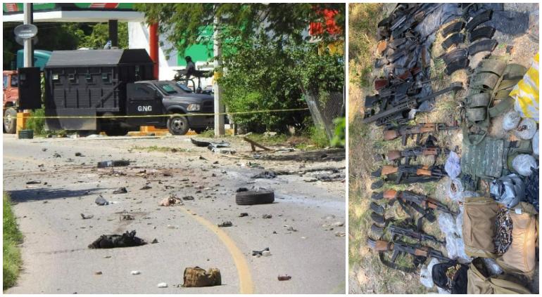 Después, en el lugar de los hechos aseguraron a 11 presuntos delincuentes, 16 vehículos (tres con blindaje artesanal), 15 armas largas, un fusil Barret, un ametralladora Minimi, múltiples cargadores y cartuchos de diferentes calibres, artefactos explosivos improvisados, resultando 14 agresores fallecidos.