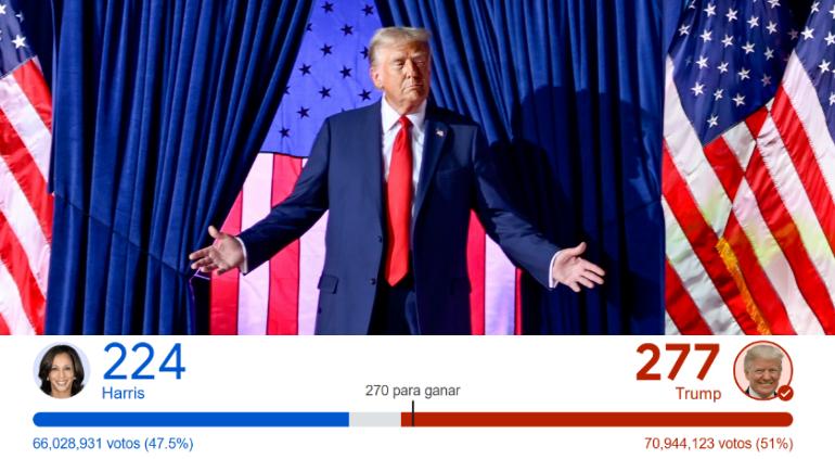 La agencia Associated Press (AP) expuso que Donald Trump consiguió 277 votos, que ya son más de los 270 necesarios para obtener la victoria. Su principal rival, Kamala Harris cuenta actualmente con 224 votos.