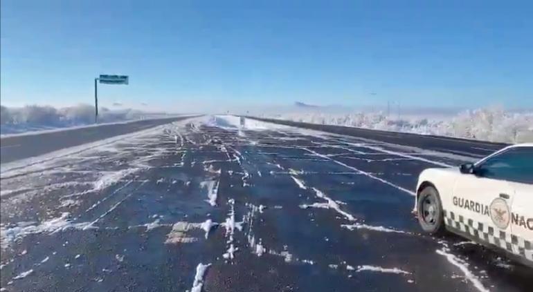 Este miércoles cerraron carreteras diversas, incluida Janos-Agua Prieta por la caída de nieve y hielo sobre la cinta asfáltica.