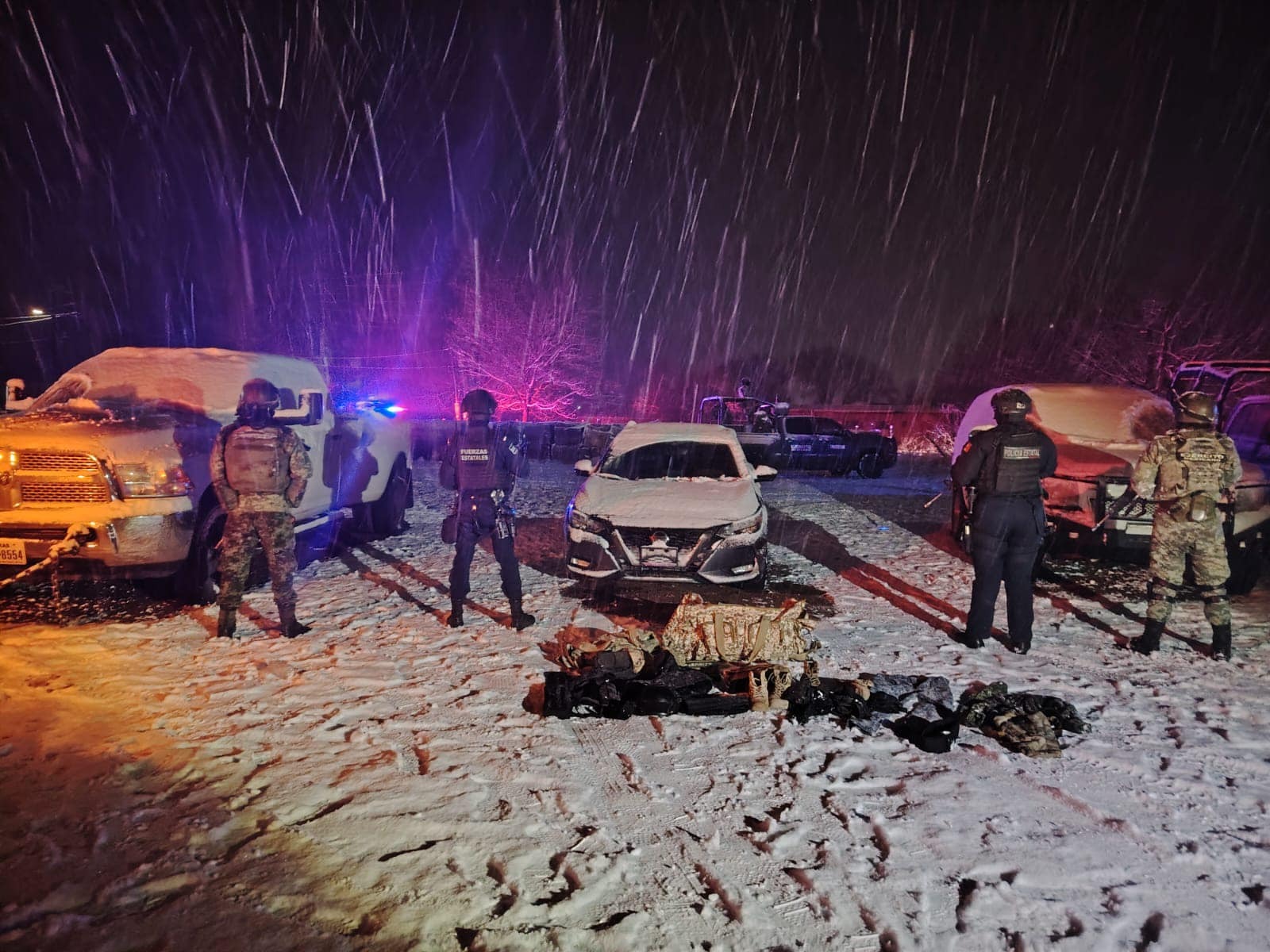 Además, se aseguró un arma de fuego corta calibre 9 mm., y 32 piezas de equipo táctico, encontradas dentro de uno de los vehículos.