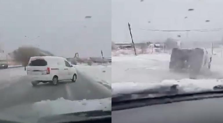 En cuestión de segundos, la camioneta derrapó con el hielo que había en la carretera, lo cuál lleva a que se salga del camino y termine volcando quedando “de lado” a las afueras de la carretera.