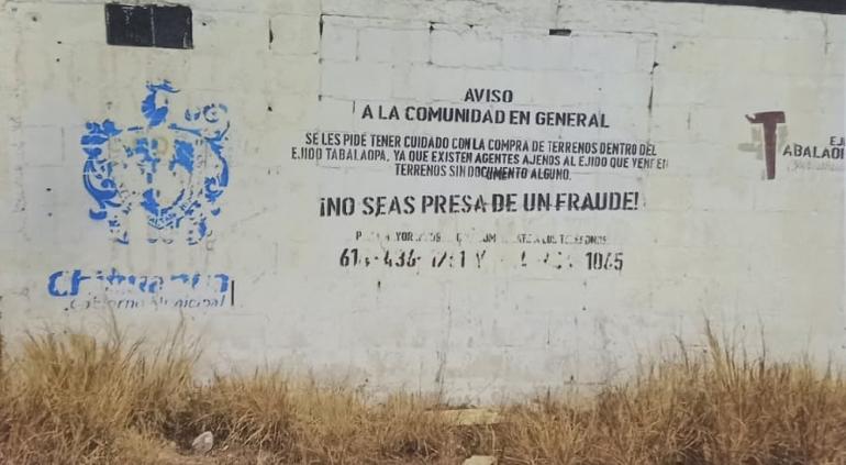 Se les pide tener cuidado con la compra de terrenos dentro del Ejido Tabalaopa, ya que existen agentes ajenos al Ejido que venden terrenos sin documento alguno.