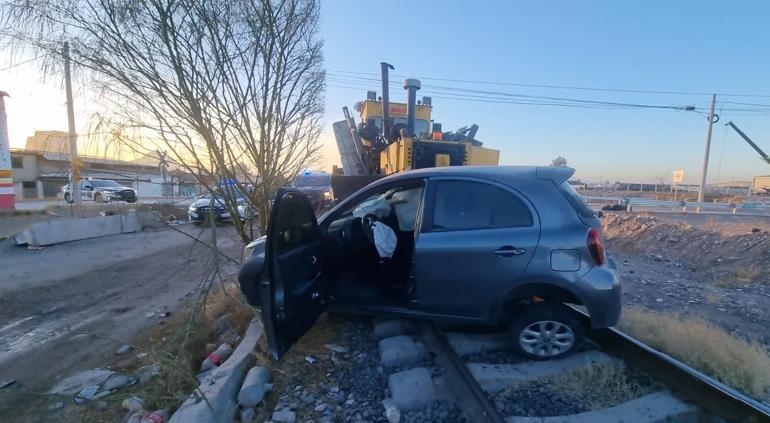 Circulaba el conductor del Nissan de oeste a este por la Sicomoro, y al llegar al cruce con las vías no se percató de la máquina reguladora, esta la impactó en su costado derecho y arrastró al auto por cerca de 30 metros.